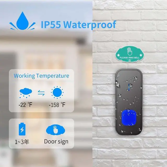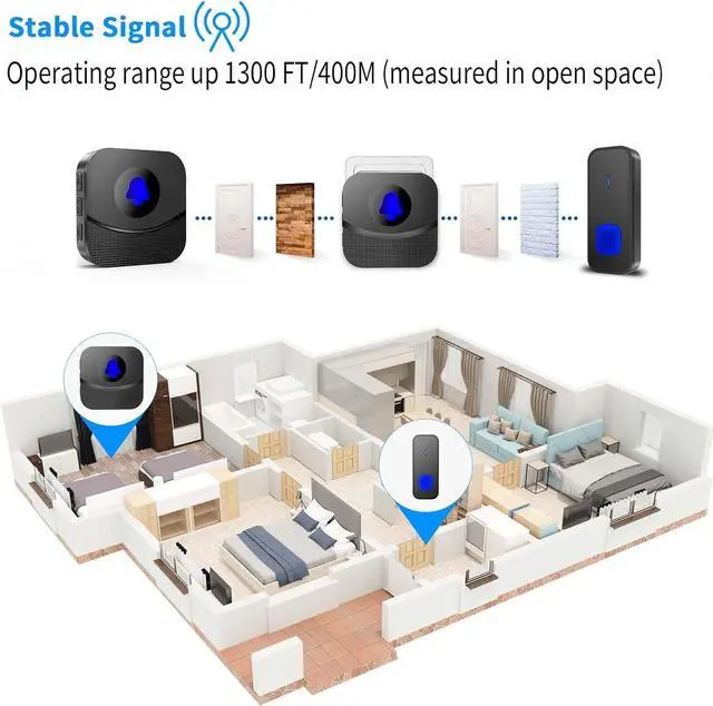 doorbell: wireless range up to 1300FT/400m (unhindered area), strong and stable wireless signal ensures that you can hear the wireless doorbell clearly, even if you are several rooms away or are on another floor.