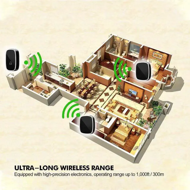 ULTRA-LONG WIRELESS RANGEEquipped with high-precision electronics, operating range up to 1, 000ft / 300m, one or more receivers suitable for one or more storey homes. Receivers can be placed on each floor and buttons can be installed at the front and back doors.