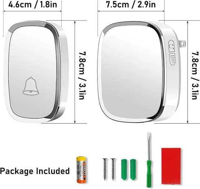 WHAT YOU CAN GET AND THE QUALITY ASSURANCE1 x transmitter (battery included), 2 x Plug-in Receiver, 1 x Adhesive patch, 2 x screws, 2 x anchors, 1 x screwdriver. Free lifetime technical support and 12-month manufacturer's warranty.