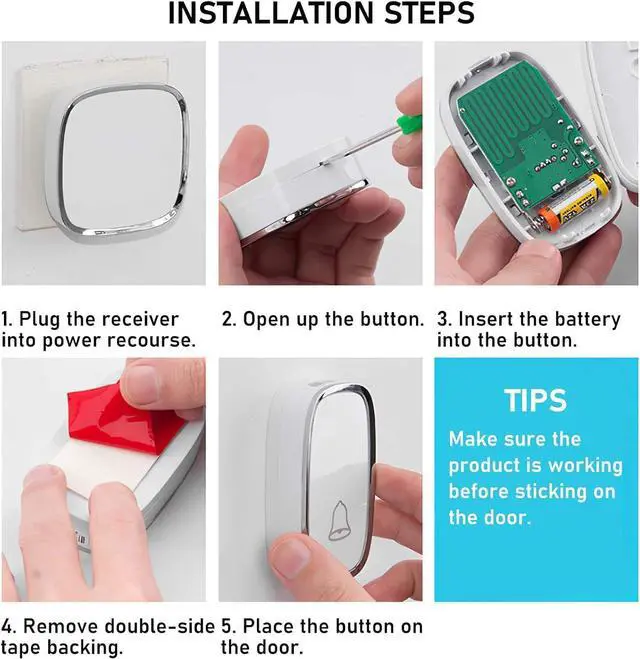 EASY TO INSTALL & USE No batteries required for receiver, simply plug into power supply; IP44 dustproof and waterproof Buttons; working temperature ranges from - 7.6 -149; withstands various harsh weather conditions; The battery life of push button boasts 3 year maximum lifespan.