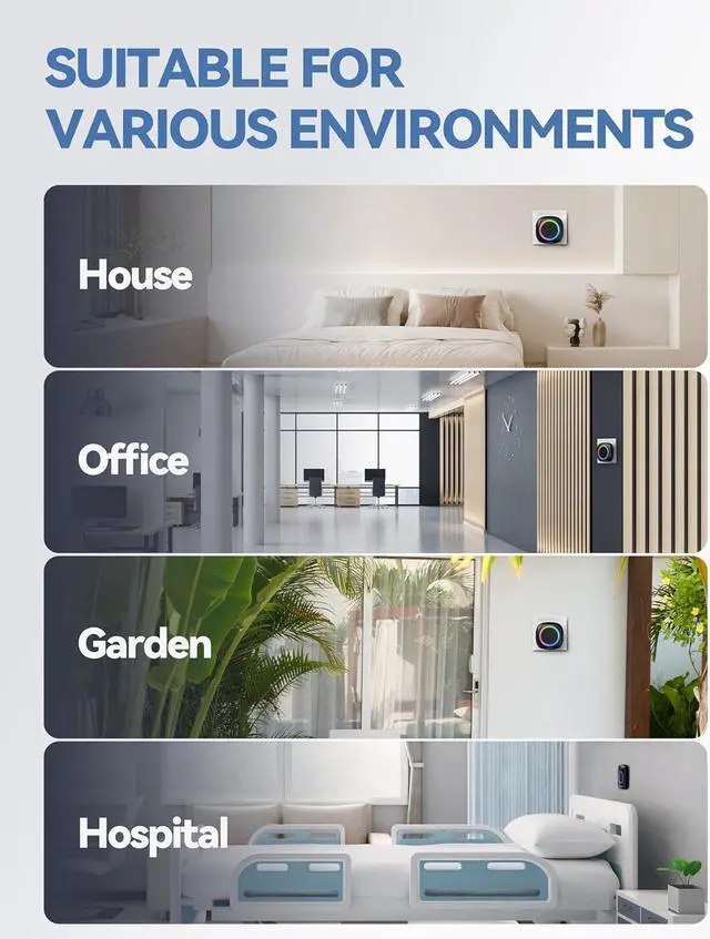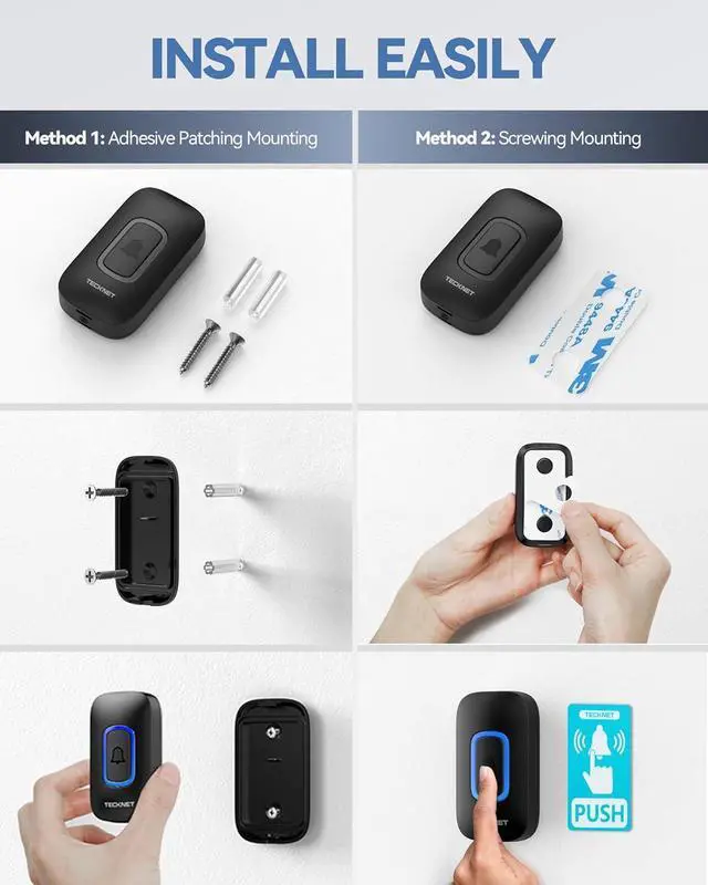 Easy to Install & ExpandableThe wireless doorbell can be installed and used in less than 1 minute. There is no need to install extra batteries, just simply plug the receiver into a wall outlet and mount the button to the door or wall with the included double-sided tape or screws. Suitable for any space such as home, garden, office, classroom, store, etc., ensuring that you won't miss a visitor.