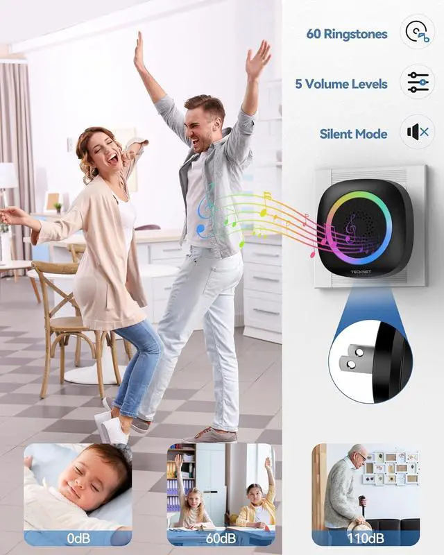 RGB Indicator with Mute ModeThis Plug-in wireless Doorbell's receiver features an eye-catching RGB light and a volume of up to 110dB, making it ideal as a doorbell for the elderly and hearing impaired individuals. if you dont want to be disturbed by someone ringing the doorbell during times of work or rest, you can simply activate the RGB light with mute mode.
