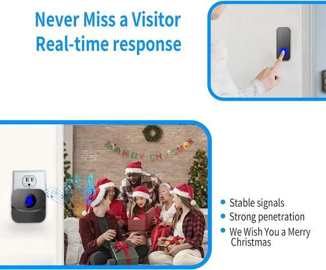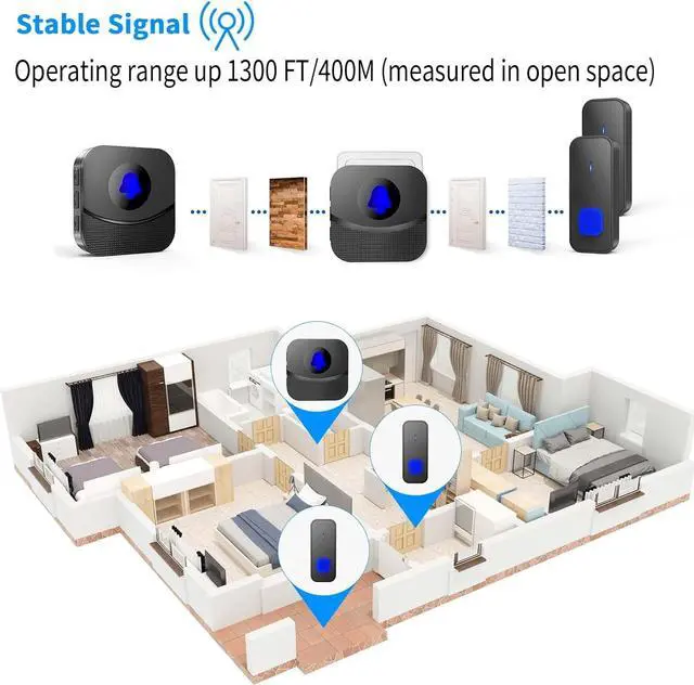 doorbell: wireless range up to 1300FT/400m (unhindered area), strong and stable wireless signal ensures that you can hear the wireless doorbell clearly, even if you are several rooms away or are on another floor.