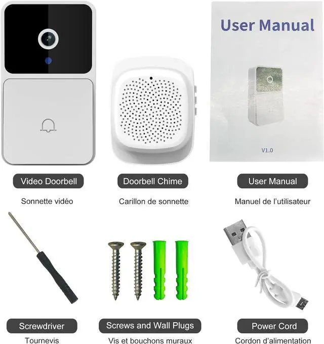 [ WHAT YOU GET ] 1 x Doorbell Wireless, 1 x Doorbell Chime, 1 x Screw Driver, 1 x User Manual, 1 x Power Cord, 1 x 3M Sticker, 2 x Screws and Wall Plugs and Friendly Customer Service
