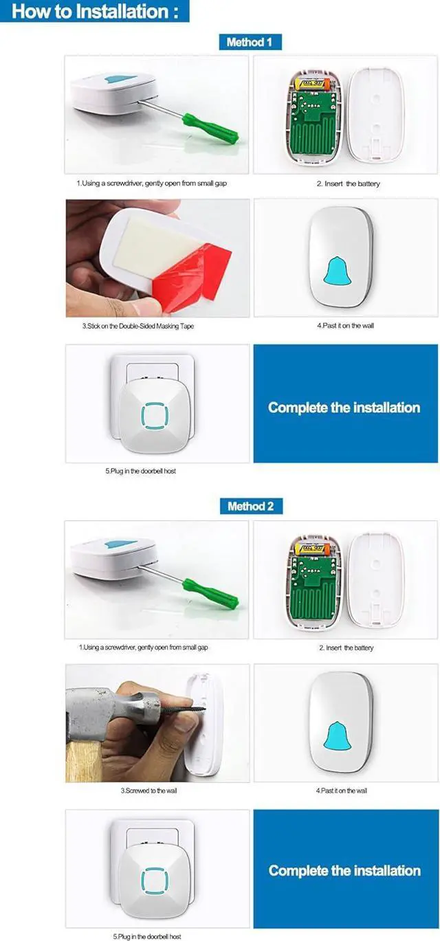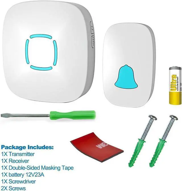 Easy to Install & Use - Easily plug receiver into an electrical outlet (no batteries required for main receiver). The push button can be fixed to the doorframe with the attached adhesive tapes. Simply mount the doorbell where needed and you are ready to go.