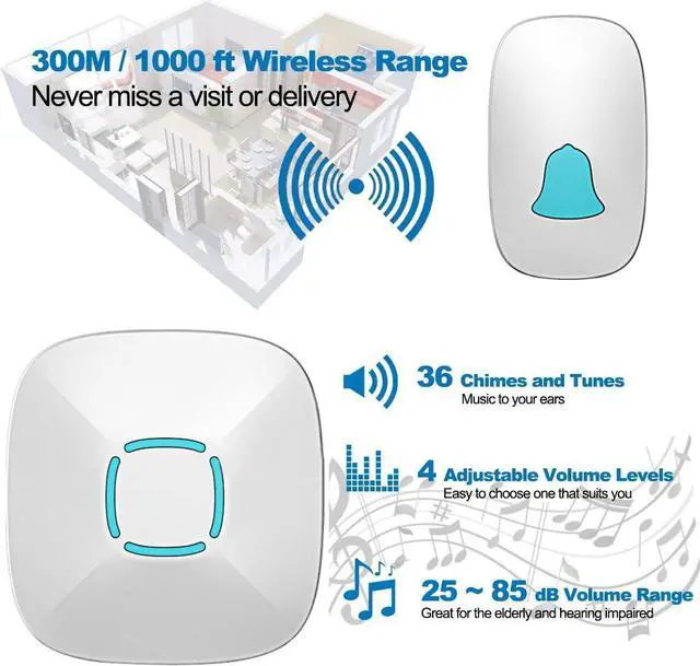 Long Range - Operating range up to 1, 000ft/300m in open area when there are no obstructions, ensures you to hear the bell and answer the door in time.