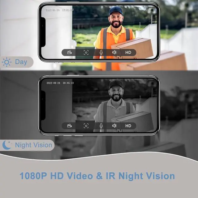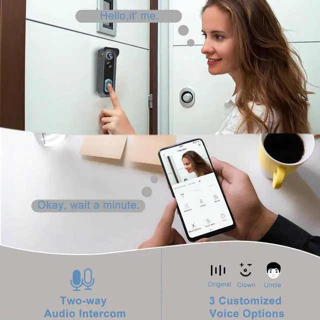 Real-time 2-way Audio & Voice Changer The doorbell camera wireless outdoor is built-in microphone&speaker provide you with real-time clear two-way audio. The door bell camera wireless has 3 optional voice tones to disguise the original voice, which protects privacy and eliminates security risks, suitable for elderly, women and younger children who live alone at home.