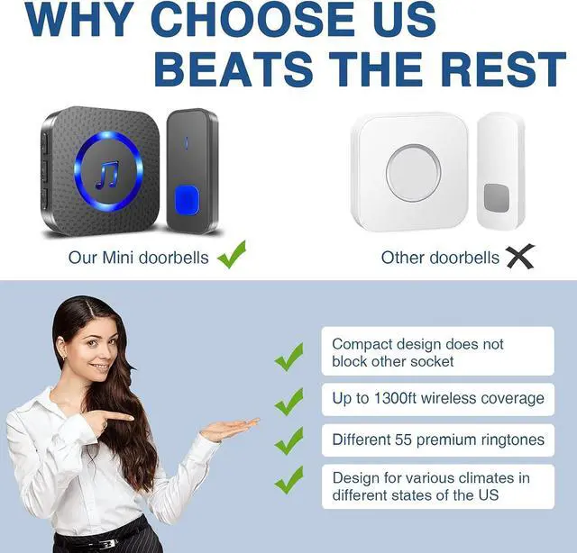 [Wide Wireless Coverage]-The doorbell operated at 1300ft ultra-long distance and stable wireless signal to ensure a reliable connection, even in other rooms or floors, you can clearly hear the doorbell