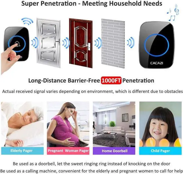 Long Wireless RangeOperating range up to 1000 feet in a straight line. With the strong signal penetration, you will always hear the bell and answer the door in time.