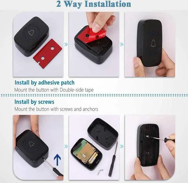 Easy InstallationNo Battery Required for Receiver. Just plug receivers into a power outlet, and the doorbell button can be fixed to your wall or door with screw or the attached adhesive tapes.