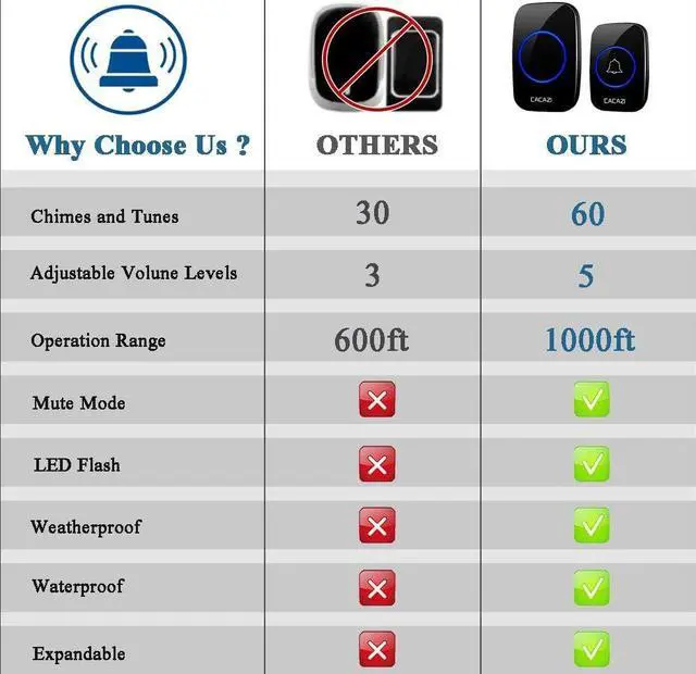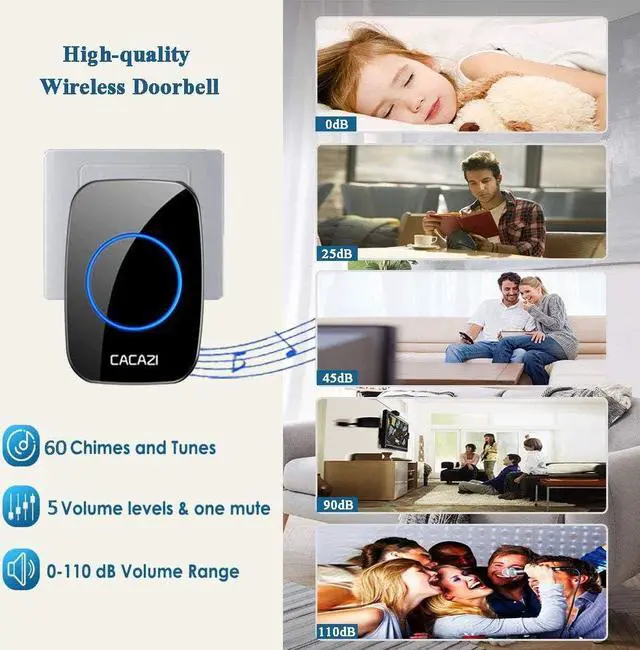 60 Chimes & 5 Volume LevelsThe receiving bell has 60 chord tones and 5 adjustable volumes ranging from 0 (Mute Mode) to 110 dB. You can pick your favourite ringtone from 60 chord tones for your receiver, LED indicator can also remind you visually.