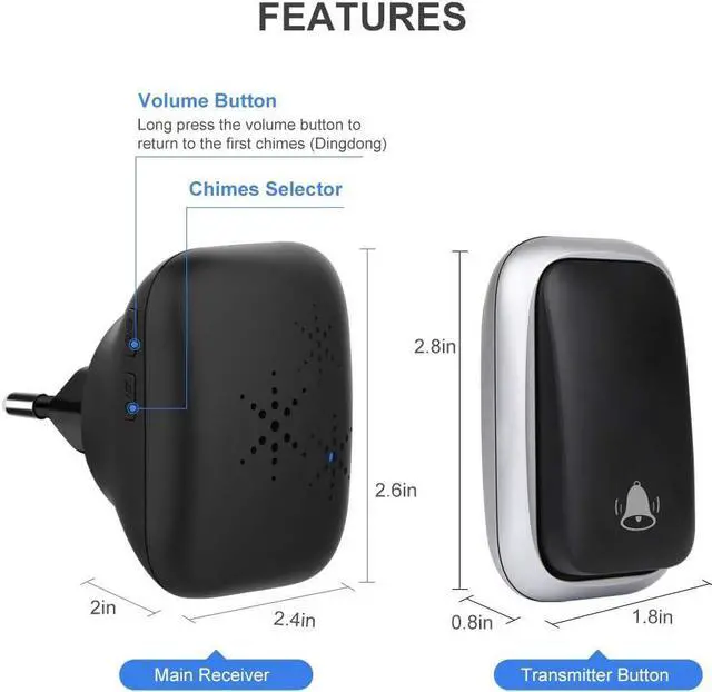 Easy InstallationSimply connect the mini receiver to a socket and attach the transmitter to a wall with the included accessories, including 2 screws and a piece of self-adhesive tape. Our door bells can be used for home, apartment, school, country houses, office and more. This cordless chime without battery is also a nice Christmas gift, birthday gift or anniversary gift for any home or business owner.
