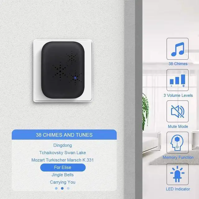 38 Ringtones & 4 Volume LevelsOur wireless stereo doorbell speaker delivers a rich and clear sound. It offers a wide range of 38 ringtones and 4 volume levels (including mute) to suit your personal taste. Press and hold the volume button to return to the first ringtone (Dingdong). With memory function, the wireless bell remembers your last settings after a power failure.