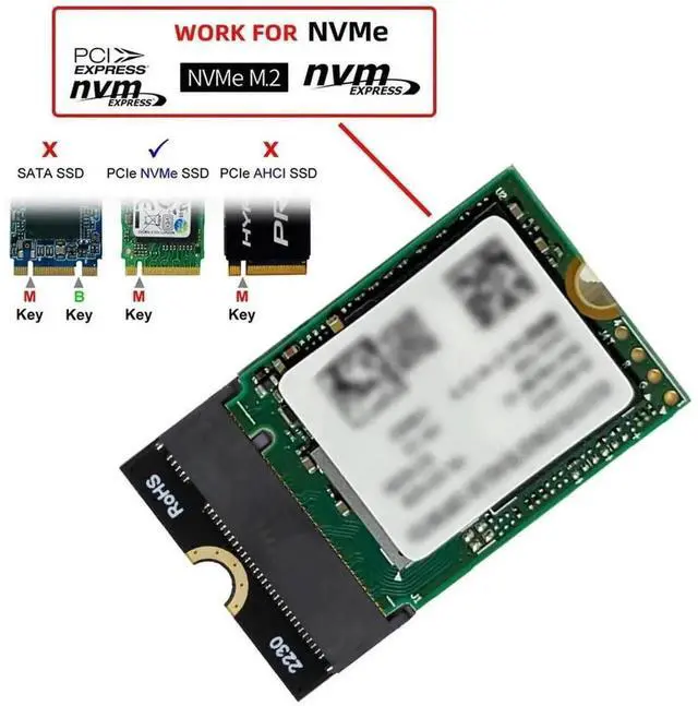 Support NGFF M.2 NVME key M 2230/2242/2260/2280 card-to-key A + E 2230; Support for Windows 8/10/11.(Note: SSD are not included.)