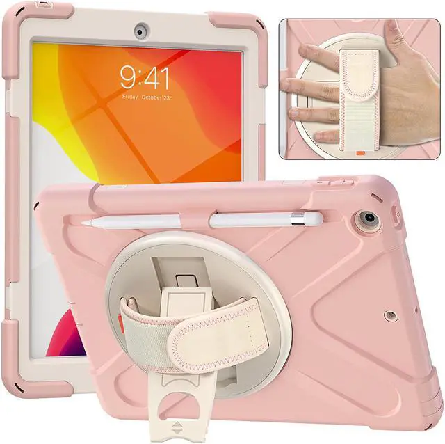 iPad 10.2 9th 8th 7th Gen Case, Shockproof Heavy Duty Rugged Stand Pencil Holder Carrying Strap Sling for Apple iPad 10.2 inch 2021/2020/2019 [Shield Cherry Blossom Pink]