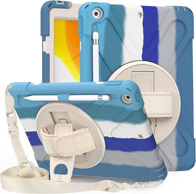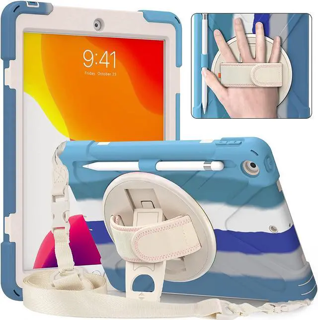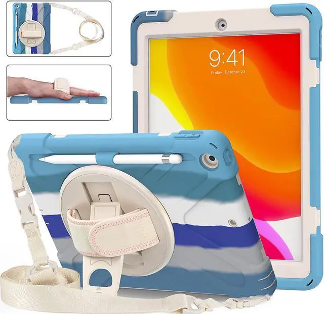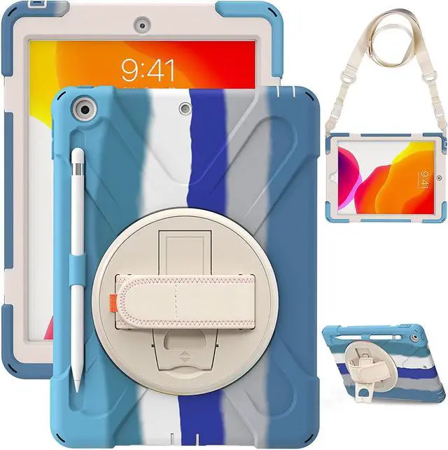 iPad 10.2 9th 8th 7th Gen Case, Shockproof Heavy Duty Rugged Stand Pencil Holder Carrying Strap Sling for Apple iPad 10.2 inch 2021/2020/2019 [Shield Color Blue Rainbow]