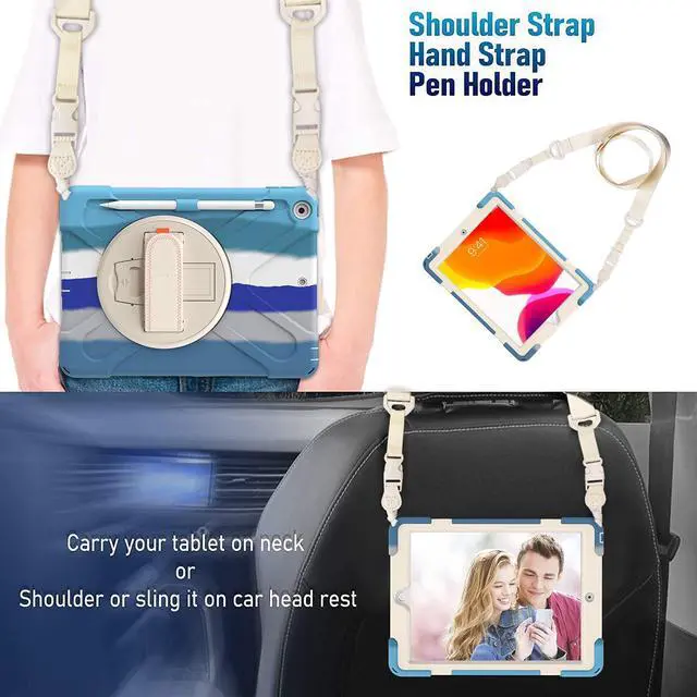 Versatile Case - Built-in stand that kicks out allowing you to watch, play, work, live videos, live stream, record or make video calls. Easily hold your tablet securely by using the built-in hand strap when you are on the move. A removable shoulder strap when installed, allows you to carry your tablet easily and comfortably over your shoulder or carry your device over your neck for your iPad 10.2-inch