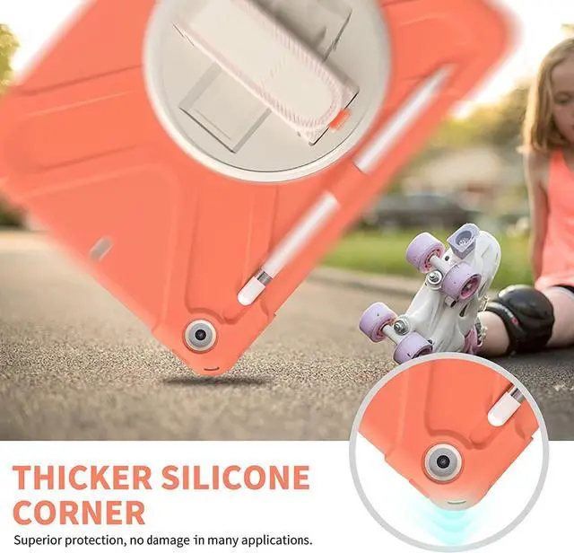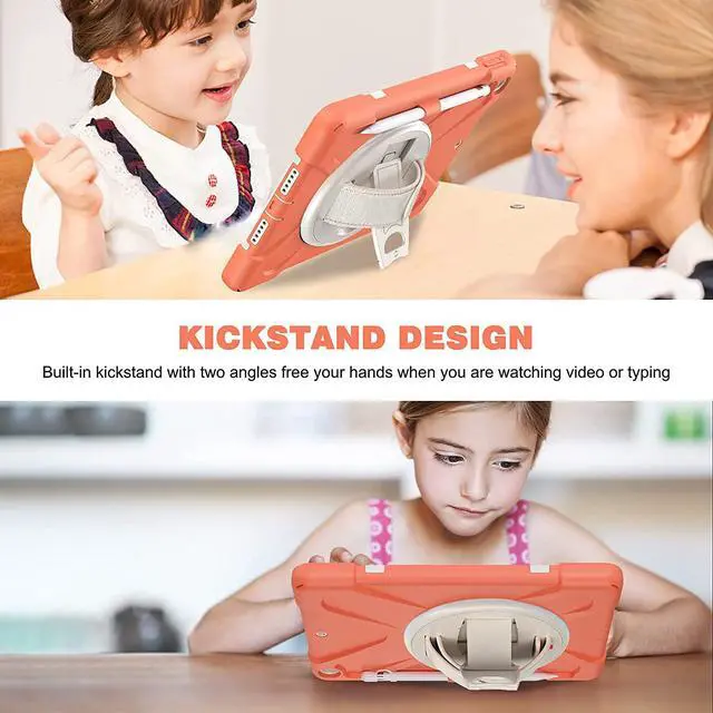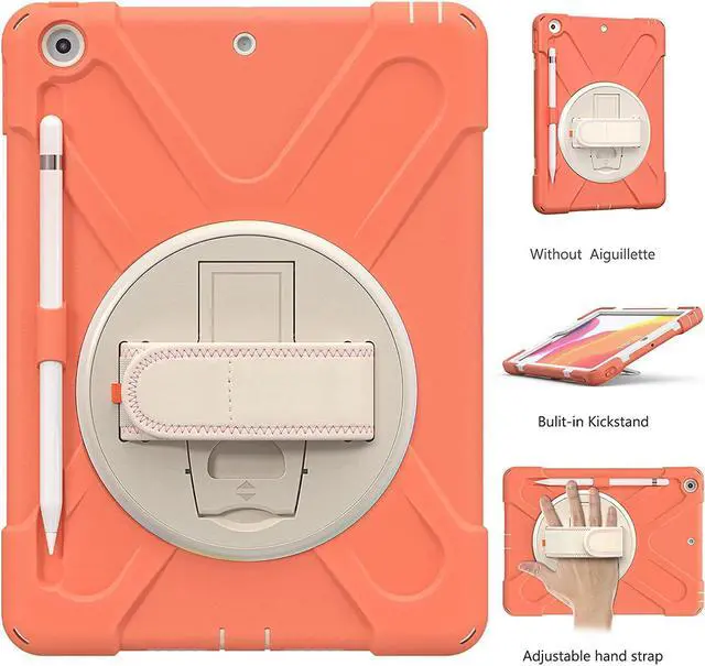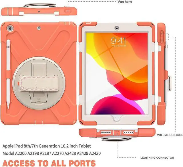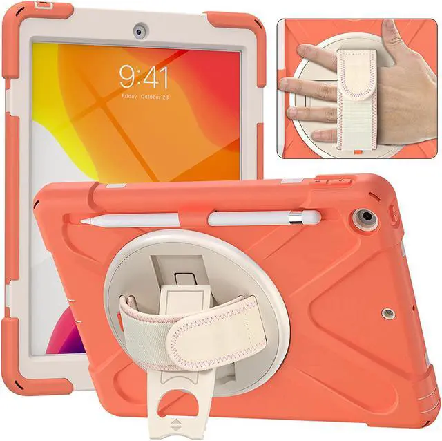 iPad 10.2 9th 8th 7th Gen Case, Shockproof Heavy Duty Rugged Stand Pencil Holder Carrying Strap Sling for Apple iPad 10.2 inch 2021/2020/2019 [Shield Living Coral]