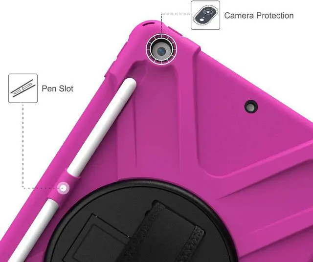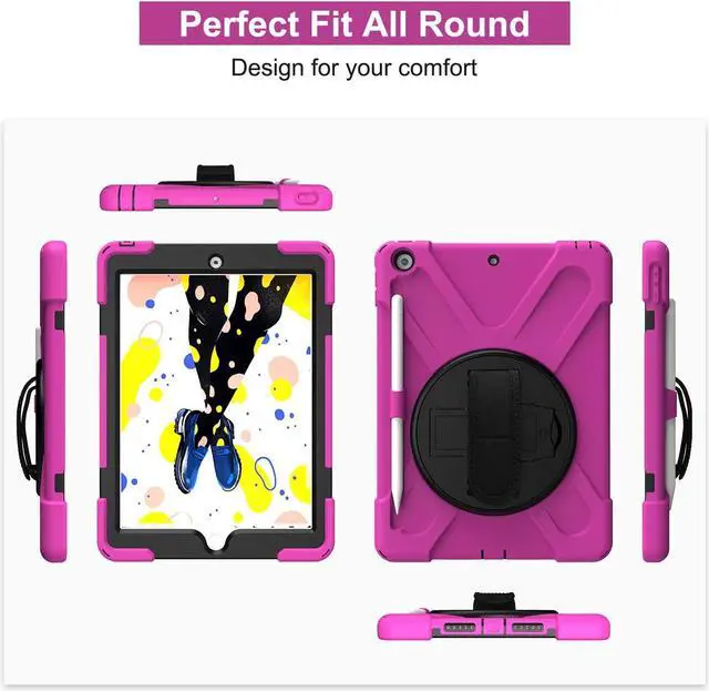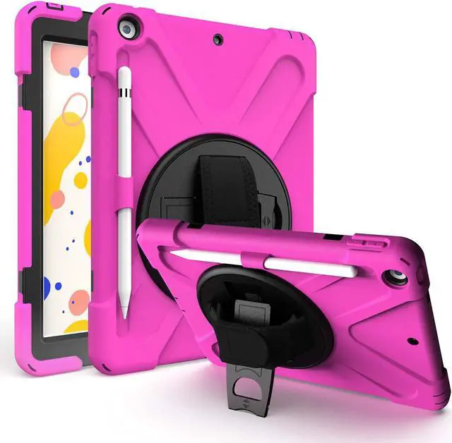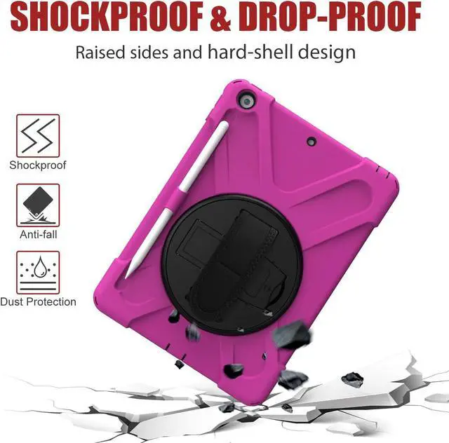 iPad 10.2 9th 8th 7th Gen Case, Shockproof Heavy Duty Rugged Stand Pencil Holder Carrying Strap Sling for Apple iPad 10.2 inch 2021/2020/2019 [Shield Hot Pink]