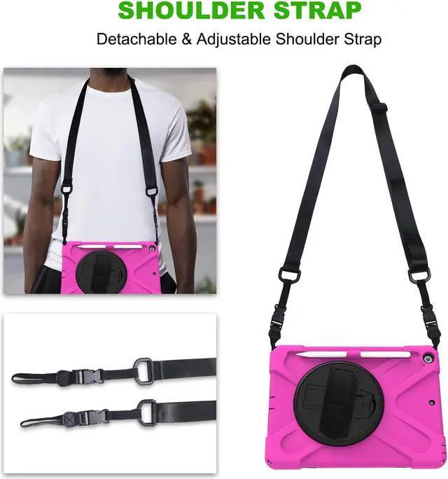 Versatile Case - Built-in stand that kicks out allowing you to watch, play, work, live videos, live stream, record or make video calls. Easily hold your tablet securely by using the built-in hand strap when you are on the move. A removable shoulder strap when installed, allows you to carry your tablet easily and comfortably over your shoulder or carry your device over your neck for your iPad 10.2-inch