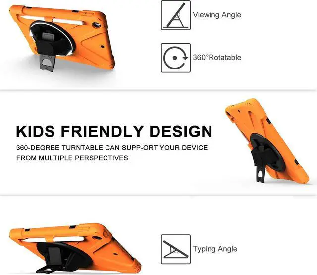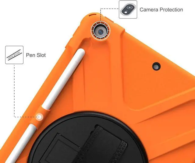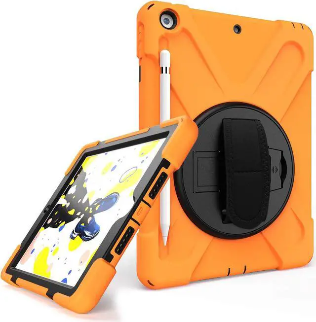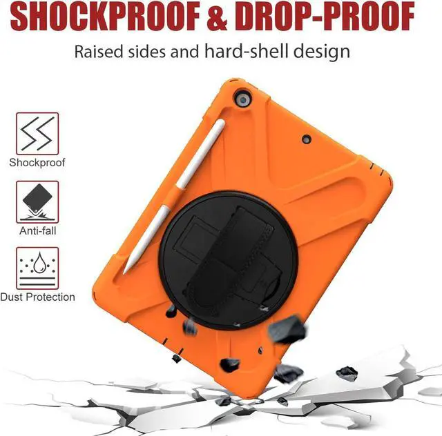 iPad 10.2 9th 8th 7th Gen Case, Shockproof Heavy Duty Rugged Stand Pencil Holder Carrying Strap Sling for Apple iPad 10.2 inch 2021/2020/2019 [Shield Orange]