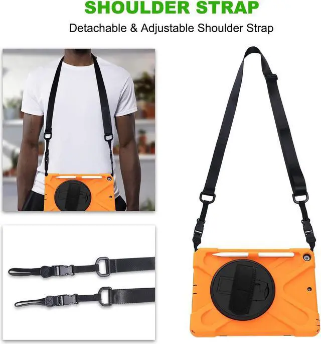 Versatile Case - Built-in stand that kicks out allowing you to watch, play, work, live videos, live stream, record or make video calls. Easily hold your tablet securely by using the built-in hand strap when you are on the move. A removable shoulder strap when installed, allows you to carry your tablet easily and comfortably over your shoulder or carry your device over your neck for your iPad 10.2-inch