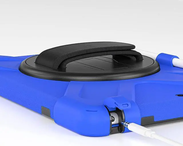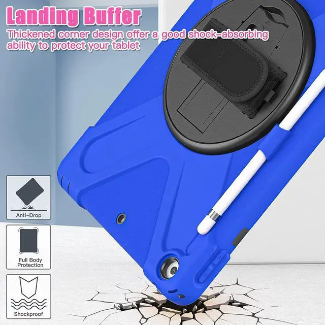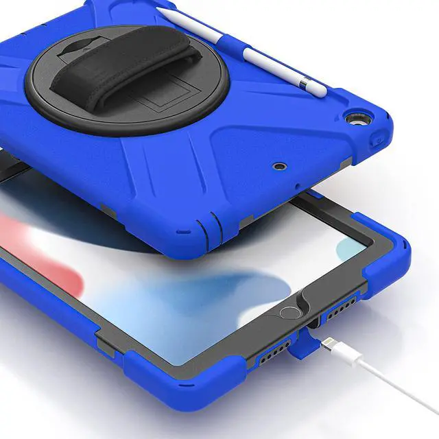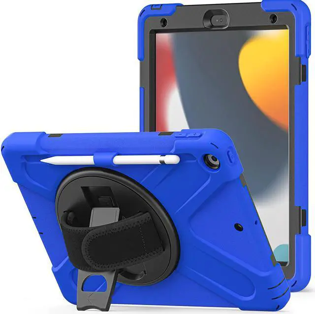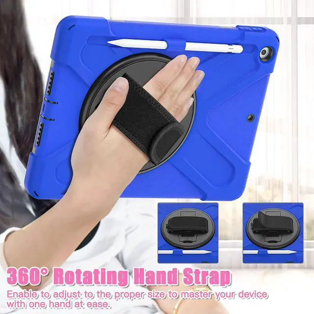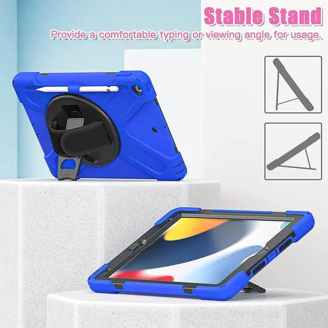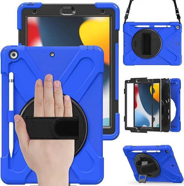 iPad 10.2 9th Generation Case, Shockproof Heavy Duty, Kickstand, Handstrap, Carrying Sling Strap, Pencil Holder, Cover for Apple iPad 10.2 inch 9th 8th 7th Gen 2021/2020/2019 Shield Dark Blue