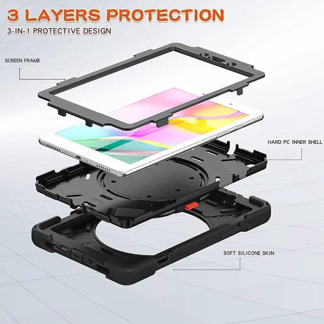 HEAVY DUTY SHIELD CASE COVER - Designed to fit the Samsung Galaxy Tab A 8.0. Specific cut-outs for the Galaxy Tab A 8.0 2019 T290/T295's charging ports, front and back camera, home button, earphone jack, and volume/power controls. This case gives you total access to your tablets features and functions such as capturing photos/videos, syncing or charging without having to remove the case. Built-in hand strap, kickstand, and includes carrying shoulder strap sling.