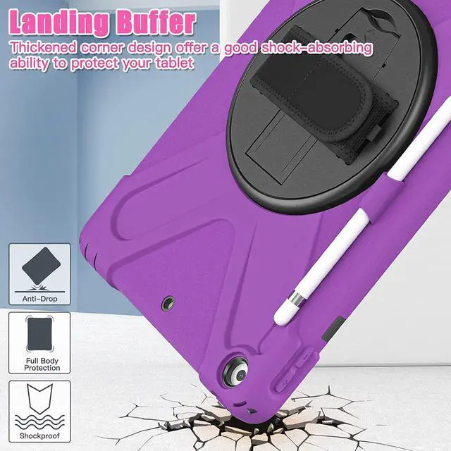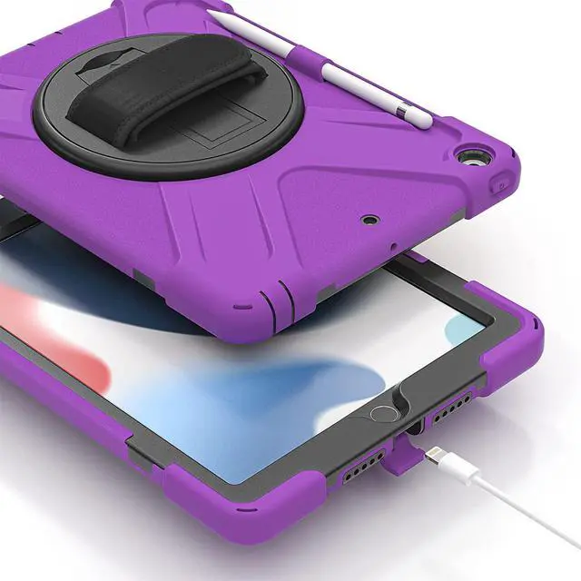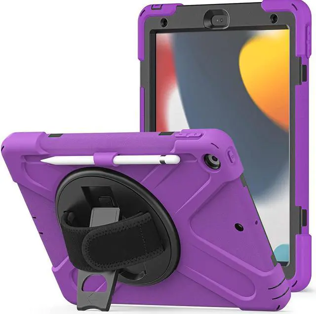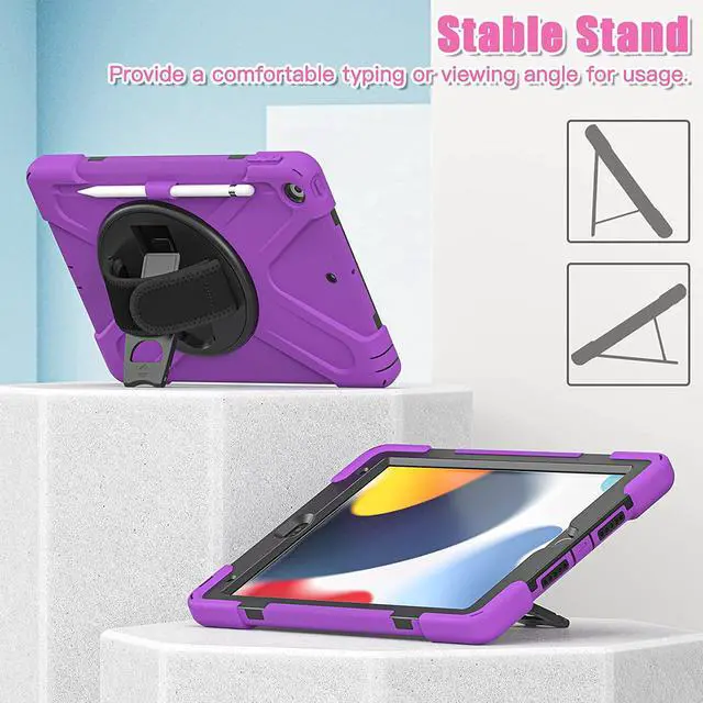 iPad 10.2 9th Generation Case, Shockproof Heavy Duty, Kickstand, Handstrap, Carrying Sling Strap, Pencil Holder, Cover for Apple iPad 10.2 inch 9th 8th 7th Gen 2021/2020/2019 Shield Purple