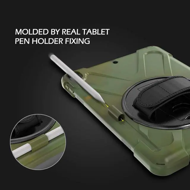 The Shield Case is built with features such as a built-in pen loop allows you to carry your compatible apple pencil with you. Integrated cut-out for the back camera to capture the perfect moements. Built-in stand to watch your favorite shows and movies. Hand strap & shoulder Strap allows you to conveniently carry your tablet.