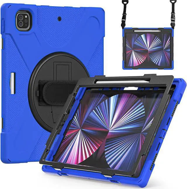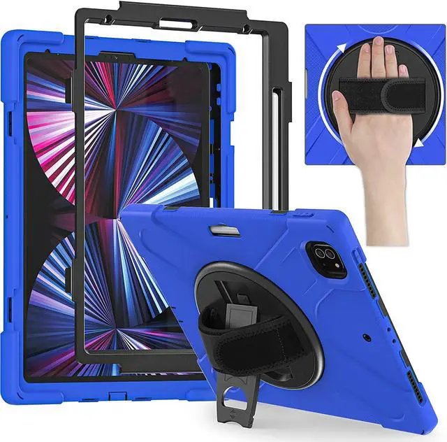 iPad Pro 12.9 Case 2021, Shockproof Heavy Duty Case Cover Stand Hand Strap with Pencil Holder for Apple iPad Pro 12.9 5th Gen [Shield Dark Blue]