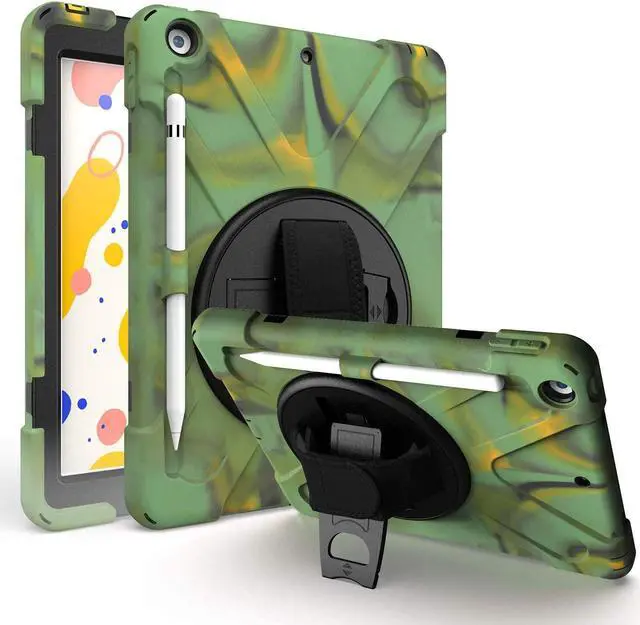 iPad 8th Gen 10.2 Case Heavy Duty Shield Case Tempered Glass Screen Protector Cover Stand Rotating Handle Palm Grip Carrying Sling Strap for Apple iPad 10.2 2019/2020 7th 8th [Camouflage]