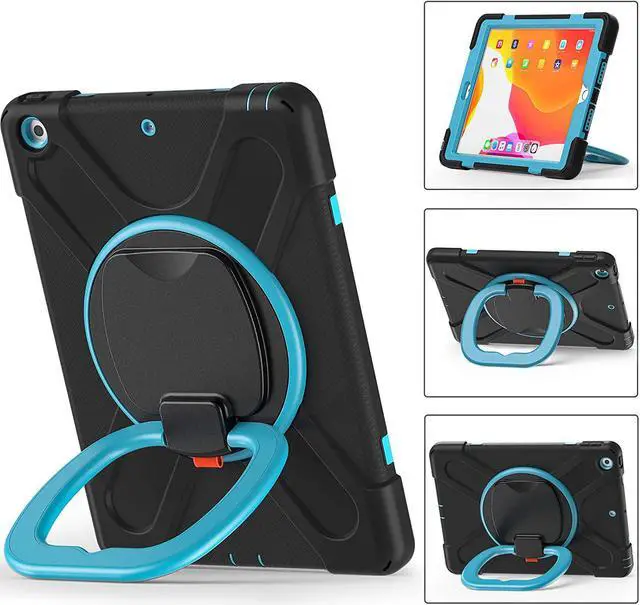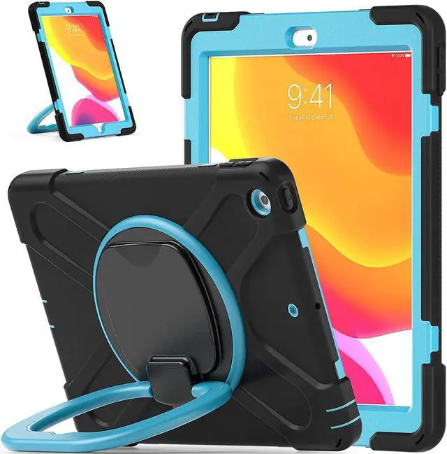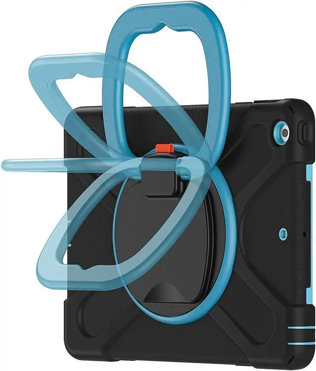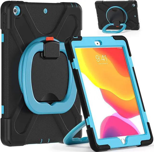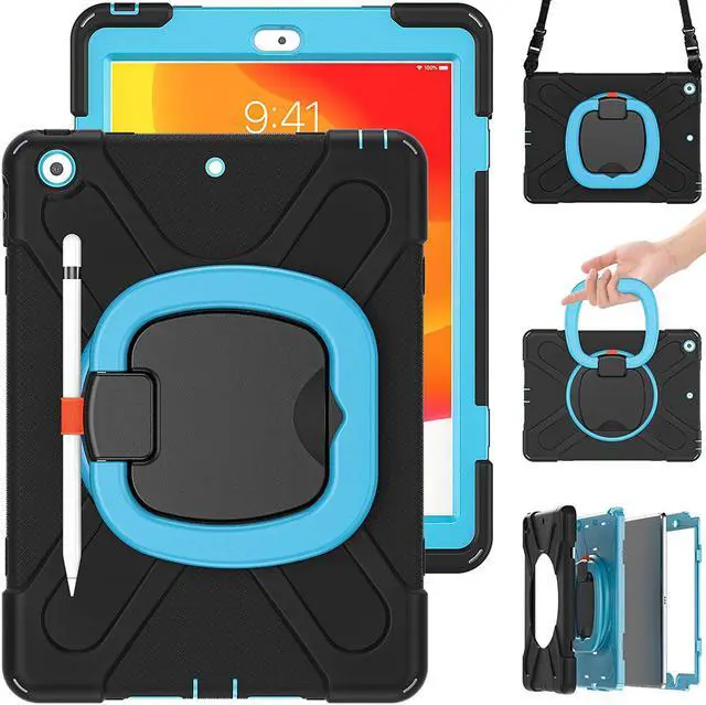 iPad 10.2 7th 8th Gen Case, Heavy Duty Protection Cover with Handle Stand Carrying Shoulder Strap Sling for Apple iPad 10.2" (Black / Light Blue)