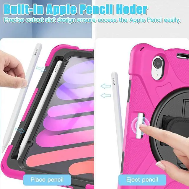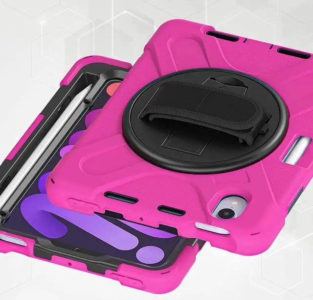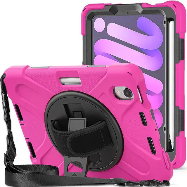 iPad Mini 6 Case, Heavy Duty Shockproof Protection, Kickstand, Hand Strap, Pencil Holder Loop, Carry Shoulder Sling for Apple iPad Mini 6 (2021) (Hot Pink)