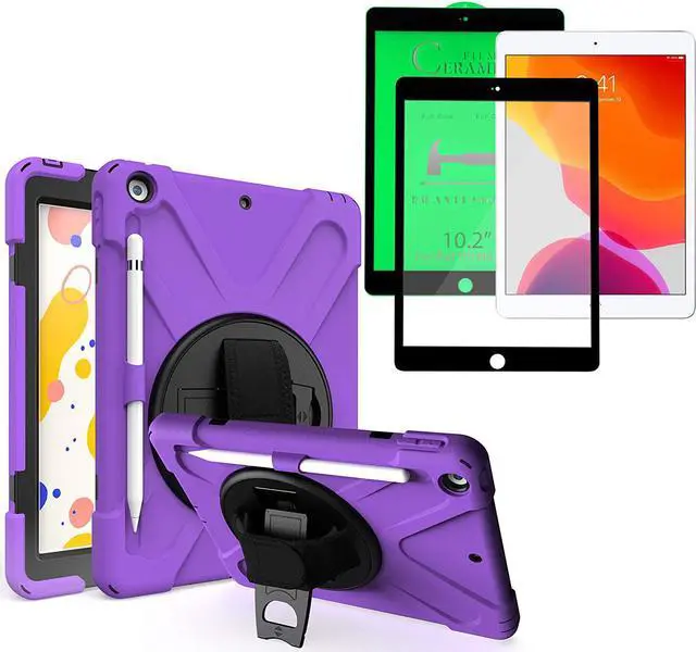 Shockproof Case Full-Body Heavy Duty Cover Stand with Shatterproof Ceramic Screen Protector for Apple iPad 10.2 7th 8th Gen (Purple)