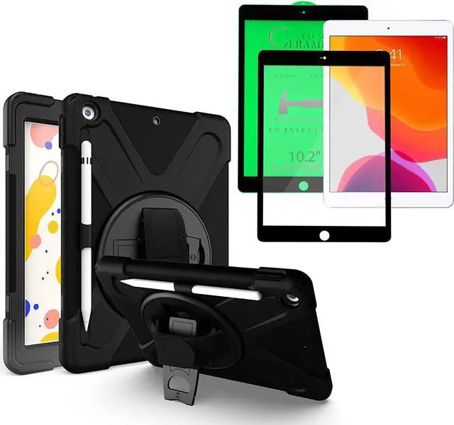 Shockproof Case Full-Body Heavy Duty Cover Stand with Shatterproof Ceramic Screen Protector for Apple iPad 10.2 7th 8th Gen (Black)