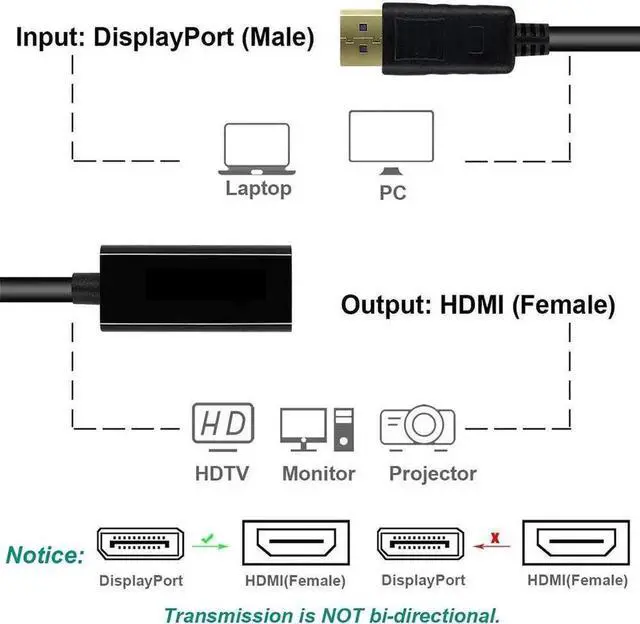 DisplayPort to HDMI Adapter provides a cost-effective and easy solution for connecting a desktop, laptop, or other devices with DisplayPort port to a HDMI display such as monitor, projector or TV. Connect the DisplayPort male end of the converter to the DisplayPort port of your DisplayPort device, and connect the HDMI female end to your HDMI cable from the display.