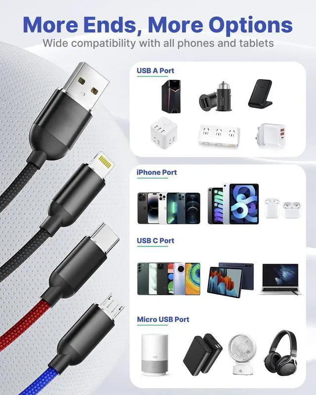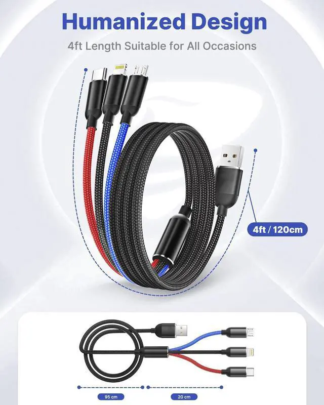 4ft is the perfect length for a charging cable for various applications, 3-in-1 design, makes the cord portable and only need one cable when you are on a business trip or traveling.