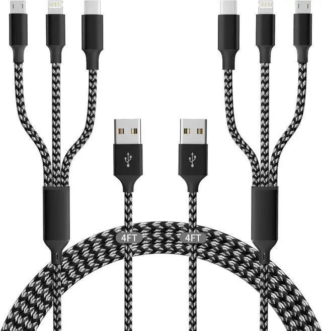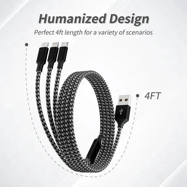 ?? 3 in 1 Charging Cable & Extensive CompatibilityAll in one this usb multi charging cable features Micro USB USB-C iPhone Lightning Cable compatible with all devices allowing you to conveniently charge multiple devices simultaneously.?? Perfect Length2Pack 4ft long multi charging cable enable you charge your phone at ease. The long length is perfect for all scenarios and there are also multi stylish color options for matching your personal style.?? Worry-free ServiceThis charging cable multiple ends offers 12-month warranty and a 7*24 timely after-sales service. Any concerns will be solved within 12 hours.