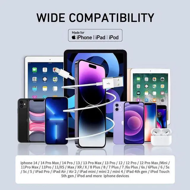 Wide Compatibility: Our usb a to lightning cable is compatible with iphone 14 Pro Max/iphone 14 Pro/iphone 13/iphone 13 Pro Max/iphone 13 Pro/iphone 13/iPhone 12/12 Pro / 12 Pro Max/11Pro Max/11Pro/11/XS/iPhone Max/iPhone XR/iPhone X/iPhone 8 Plus/iPhone 8/iPhone 7 Plus/iPhone 7/iPhone 6s Plus/iPhone 6s/iPhone 6Plus / 6 / 5s / 5c / 5 / iPad Pro / iPad Air / Air 2 / iPad mini / mini 2 / mini 4 / iPad 4th gen / iPod Touch 5th gen / iPod.