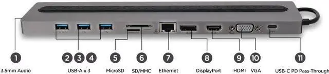 IOGEAR USB-C 8 Port Low Profile Docking Station - 4K@30Hz - 1 HDMI - 1 DisplayPort - 1 VGA - 1 Ethernet - 3 USB 3.0 A Ports - 1 USB-C 100W Charging Only - Card Reader Slot - 1 3.5mm - GUD3C02B