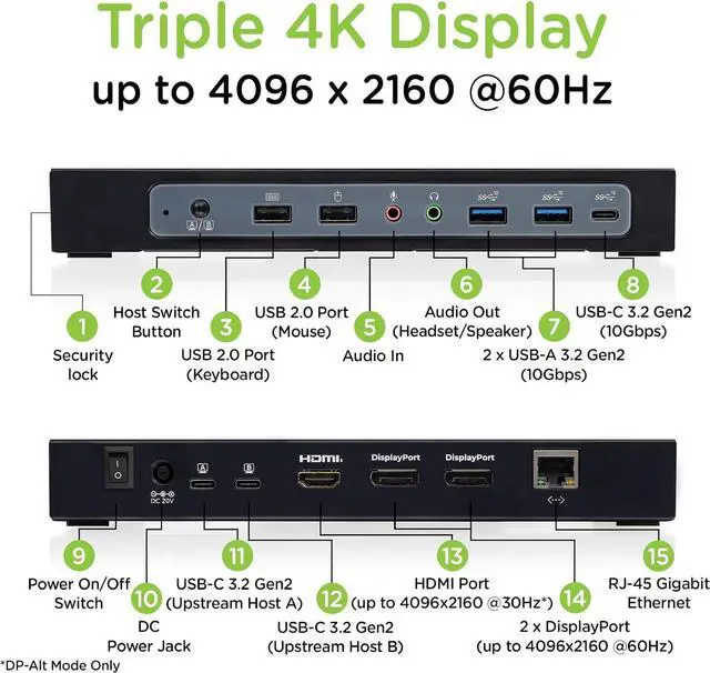 Manufacturer: IOGEAR, Inc. Manufacturer Part Number: GUD3CDHTAA. Brand Name: IOGEAR. Product Line: Dock Pro. Product Name: Dock Pro Duo USB-C Docking Station. Packaged Quantity: 1. Product Type: Docking Station. [Technical Information] Connectivity Technology: Wired. Device Supported: Desktop PC/Notebook/Keyboard/Mouse/Microphone/Speaker/Headset. Number of Displays Supported: 3. Screen Mode Supported: 4K. Supported Resolutions: 3840 x 2160. [Network & Communication] Ethernet Technology: Gigabit Ethernet. [Interfaces/Ports] Host Interface: USB Type C. Audio Line In: Yes. Audio Line Out: Yes. Total Number of USB Ports: 7. Number of USB 2.0 Ports: 2. Number of USB 3.2 Gen 2 Type-A Ports: 2. Number of USB Type-A Ports: 4. Number of USB Type-C Ports: 3. USB Type-A: Yes. USB Type-C: Yes. USB Type-C Detail: 1 x USB-C 3.2 Gen 2 (10 Gbps). Network (RJ-45): Yes. Number of RJ-45 Ports: 1. Number of Network (RJ-45) Ports: 1. Number of DisplayPorts: 2. DisplayPort: Yes. Number of HDMI Ports: 1. HDMI: Yes. USB Power Delivery: 100W. [Software] Operating System Supported: Windows 10. Windows 11. Mac OS X 10.13+. macOS. Linux. [Power Description] Maximum Power Supply Wattage: 230 W. Power Source Type: Power Adapter. [Physical Characteristics] Height: 1.20". Width: 3.40". Weight (Approximate): 1.50 lb. [Miscellaneous] Package Contents: Dock Pro Duo USB-C Docking Station 2 x USB-C to C Cables for Host Computers 1 x Power Adapter 1 x QSG 1 x Warranty Card. Kensington Security Slot: Yes. TAA Compliant: Yes. [Warranty] Limited Warranty: 1 Year.