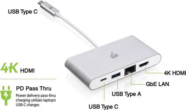 USB-C Power Charging Pass-Thru:Connect your laptop's original USB-C charger to the multi-port adapter and charge your laptop while you work or play.Providing up to 60W of power delivery, your laptop will charge at the fast rate you expect from USB-C.When you are not charging your laptop, you can use the USB-C port to plug in any USB-C devices.