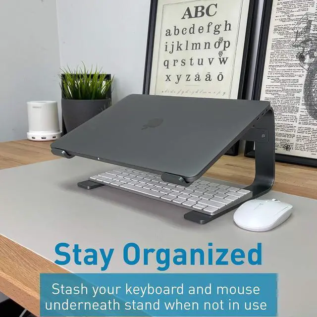\u2022 Keep the desktop tidy by stash your keyboard and mouse under the stand while not in use