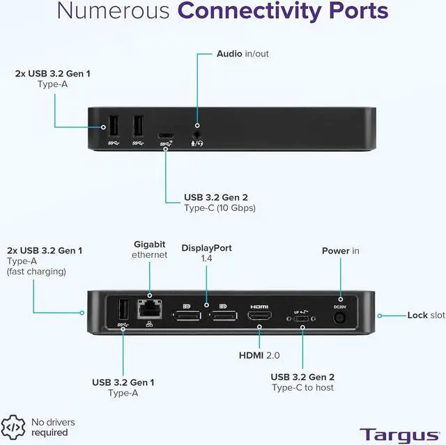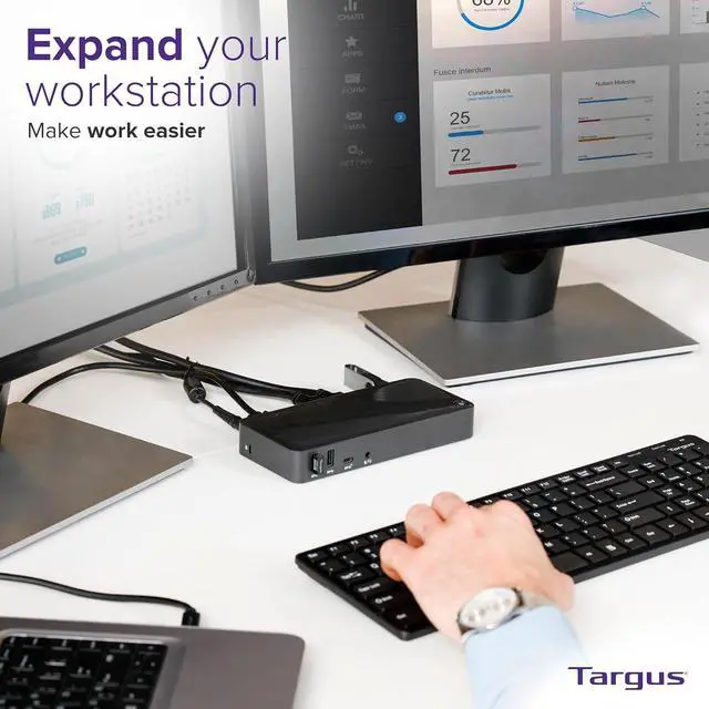 Create a more powerful, productive workstation with the Targus USB-C DisplayPort Alt. Mode Triple Video Docking Station with 85W Power. When it comes to choosing a USB C docking station dual monitor compatible, this dock outshines the rest. This Alternate Mode dock packs all of the ports and power you need and is designed to support and power a wide variety of laptop brands and operating systems up to 85W. A great Windows or Mac docking station dual monitor capability will deliver the monitor quality you expect from Targus. With video performance up to 3840x2160 p60 for single display, 2560x1440 p60 for dual displays, and 1920x1080 p60 for three displays, you are sure to get crisp and clear images. Connect all of your favorite accessories with a combination of USB-A (4 USB 3.2 Gen1 ports, 1 fast-charging) and USB-C (1x 3.2 Gen2), plus Ethernet and audio ports. * Extended or mirrored support, max resolution, and power delivery depend on the hosts graphic capabilities. These additional ports make this the dock that beats all other docks. You'll have all the connectivity you want to keep you satisfied for year. Plus when you buy a Targus product, you get our 3 year limited lifetime warranty. This means we've got you covered. With a universal docking station, you can go from laptop to desktop with a single USB connection. Thanks to the power and versatility of USB-C, you can connect your accessories, including peripherals and monitors. And with Targus, you get docking stations fully-tested for a wide variety of platforms and operating systems. You can be confident our docks will be compatible with your workstation! Not only is it compatible with your workspace, it transforms it. If youre trying to connect to external monitors and peripherals with just your laptop, youll get a mess of wires that clutter your workspace. With Targus docking stations for both Mac and PC computers, your desk becomes composed and organized.