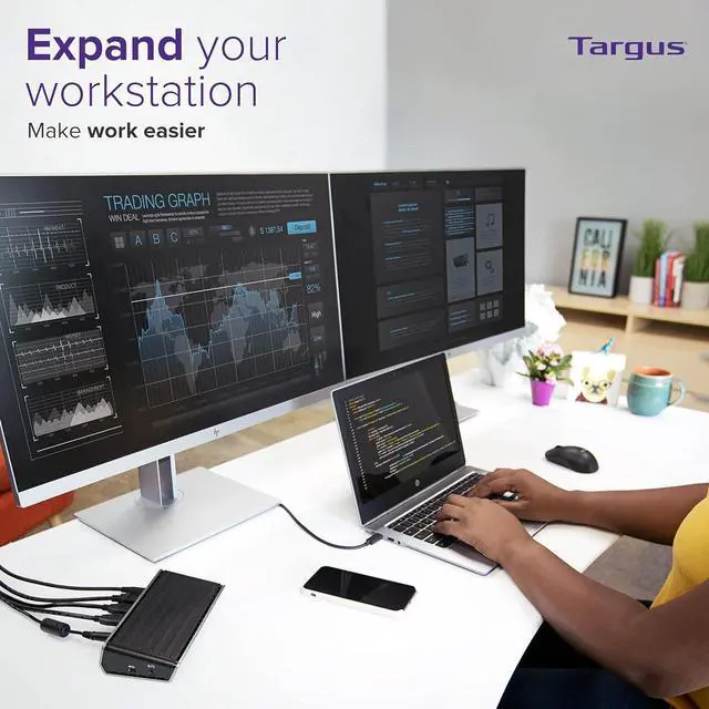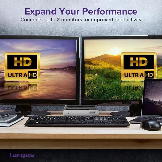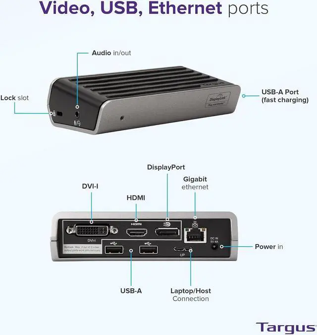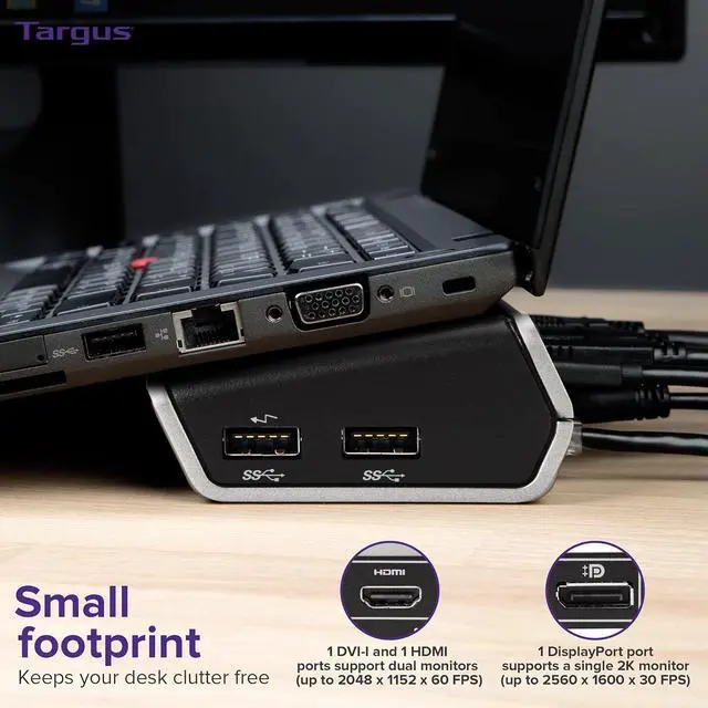 Super-size your productivity, while streamlining your home office workspace, with the Targus VersaLink Dual HD Video Universal Dock. Designed for universal compatibility, this laptop docking station dual monitor connects dual HD monitors or a single 2K monitor, and offers plenty of connections for the peripherals you use mostkeyboards, mice, external drives, printers, and more. With 1 DVI-I and 1 HDMI port, this is a great HDMI hub for multiple monitors. A security lock slot keeps the usb-c dock secure, and a slanted design enables a comfortable typing angle for laptops. Its all in a compact footprint thats about half the size of a traditional dock. Whether you're looking for a Windows or Mac docking station dual monitor, the DSU300 will tick all your boxes. Handy connections, with less clutter. Our docks work with Mac® and PC platforms, as well as with Chrome OS, Android, and Linux®. This broad compatibility supports flex working applications like hoteling and hot-desking, and provides a future-proof solution that eliminates the need for replacement during every laptop refresh. A single USB cable easily expands workstations with the addition of multiple displays and your go-to peripherals. So, there's no need to plug in accessories each time you come and go from your desk. Universal docking stations help free up desk space and keep cables tangle-free. Since a single connection links all your peripherals to your laptop, your workspace stays neat and organized. Backed by a three-year limited warranty, you can count on Targus docking stations to provide a reliable connection and stand up to daily use during even the most demanding workdays.