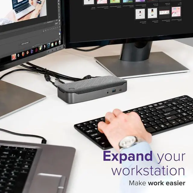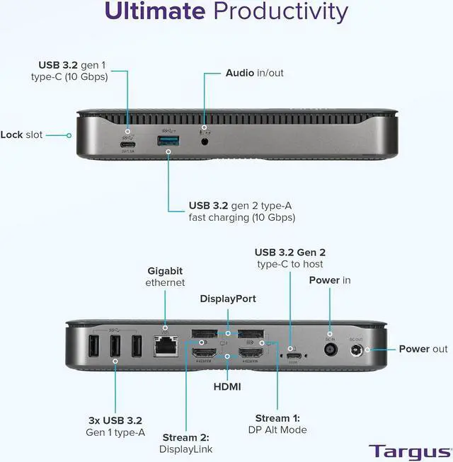 The New Hybrid Docking Station : Universal Compatibility As the first-to-market universal dock that supports four 4K displays, or a single 8K display plus two 4K displays, via a single USB-C cable, and designed with both DP Alt Mode and DisplayLink technologies, it has universal compatibility in its DNA to work with practically any PC host connection: Windows, macOS, and other major operating systems*. PrimeAs the first-to-market universal dock that supports four 4K displays, or a single 8K display plus two 4K displays, via a single USB-C cable, and designed with both DP Alt Mode and DisplayLink technologies, it has universal compatibility in its DNA to work with practically any PC host connection: Windows, macOS, and other major operating systems*. Whether you need to connect to one monitor or four (ok, even two or three), this dock supports your needs. Leveraging both HDMI and DisplayPort video technologies, you can connect up to four 4K displays, or experience the grandeur of 8K resolution on a single display alongside two 4K displays! Experience unbeatable triple monitor compatibility all in one place using a single docking station.The USB-C Hybrid/Universal 4K Quad Docking Station provides up to 100W to simultaneously charge your PC, while also offering a second USB-C port (7.5W) and USB-A port (up to 12W) to power smaller accessories, like a phone. With one USB 3.2 Gen 2 Type-C port, one USB 3.2 Gen2 Type-A (fast charging) and three USB 3.2 Gen 1 Type-A ports, its simple to connect the latest keyboards, exterior drives, and other peripherals to customize your workspace experience. The docking station dual monitor 2 HDMI also includes a fast-charging port for charging your smartphone, tablet, or other devices. You'll have all the connectivity you want to keep you satisfied for year. Plus when you buy a Targus product, you get our 3 year limited lifetime warranty. This means we've got you covered. With a universal docking station, you can go from laptop to desktop with a single USB connection. Thanks to the power and versatility of USB-C, you can connect your accessories, including peripherals and monitors. And with Targus, you get docking stations fully-tested for a wide variety of platforms and operating systems. You can be confident our docks will be compatible with your workstation!