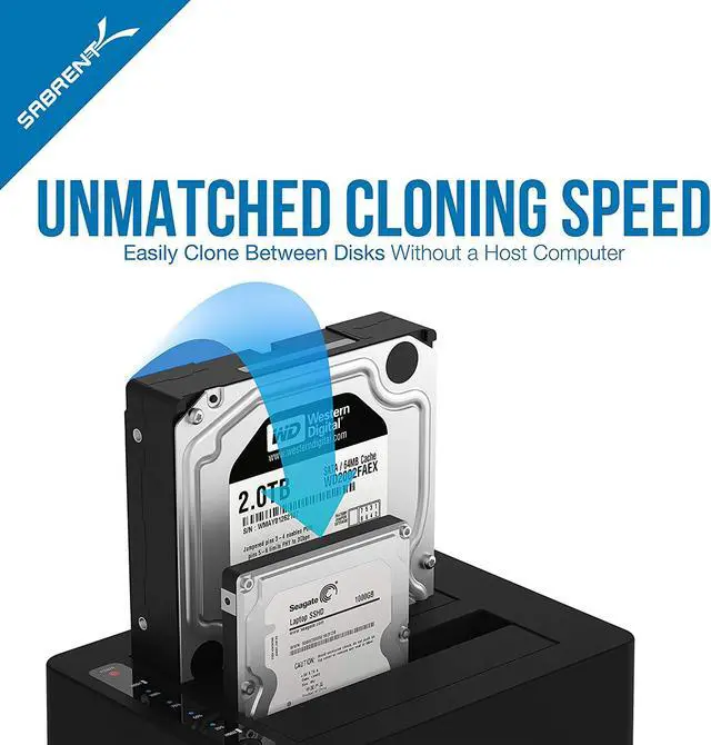 Description: The Sabrent EC-DSK2 SATA Docking Station supports the direct insertion of Desktop two 2.5" / 3.5" SATA Hard Drives. It is a caseless solution that makes swapping hard drives easier than ever before. Plus, now you can take advantage of the lightning speed of USB 3.0 to quickly transfer files up to 5 Gbps! Connect any 2.5" / 3.5" Serial ATA (SATA) or SATA II Hard Drive to your computer through an available USB 3.0 port on your desktop or laptop. Hard Drive Duplicator Function The Sabrent EC-DSK2 Standalone Duplicator Dock can be used to duplicate/clone an existing hard drive without connecting to a computer, or simply as external storage to transfer data between a hard drive and your computer.
