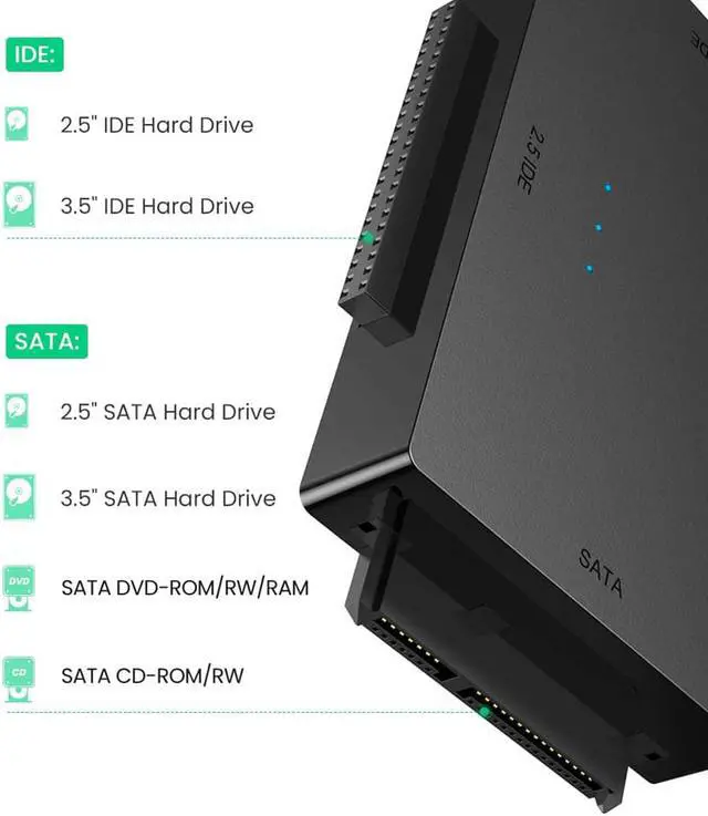 Get all your drives active combo: UGREEN USB 3.0 to SATA IDE converter allows you to connect 2.5"/3.5" Ide/SATA hard disks through USB port to the computer. This is a perfect tool to duplicate, copy, backup or transfer large amounts of data from one drive to another. It has a SATA II connector and two IDE connectors (40pin and 44pin).