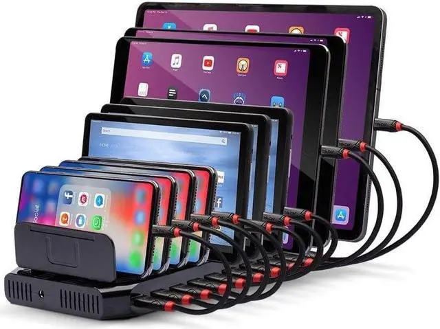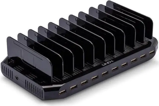 The Lindy 10 Port USB Charging Station allows charging up to 10 USB devices like tablets or smartphones. Each port can provide up to 5V 2.4A to satisfy the most hungry power devices. If all 10 ports are occupied, the maximum current is 1.8A per port. With its smart charging function, this USB Charging Station can recognise the connected device to automatically adjust the charging current for a fast and safe charge while also providing overcurrent protection to avoid excessive current damaging the device. Plastic dividers can be assembled and stood on the top of the unit, which allows different widths for different tablets or mobile phone sizes. This product is perfect for use in schools, libraries, hotels, restaurants or any location that uses multiple devices. Country specific power cables are provided for seamless use of the charging station, ideal for global events or integration into installations abroad.